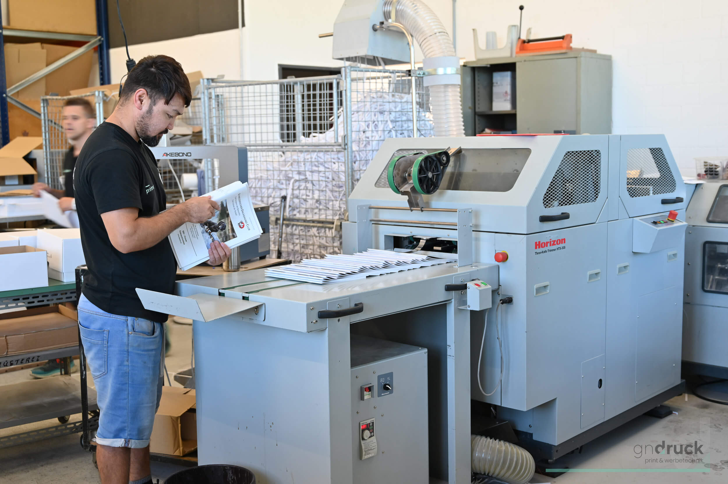 Unsere gehefteten Broschüren werden auf unserem modernen Horizon Stichliner produziert, der höchste Präzision und Effizienz garantiert. Neben der klassischen Heftung bieten wir auch Ringösenheftung an, die es ermöglicht, Broschüren leicht in Ordnern abzuheften – ideal für Schulungsunterlagen oder Kataloge.