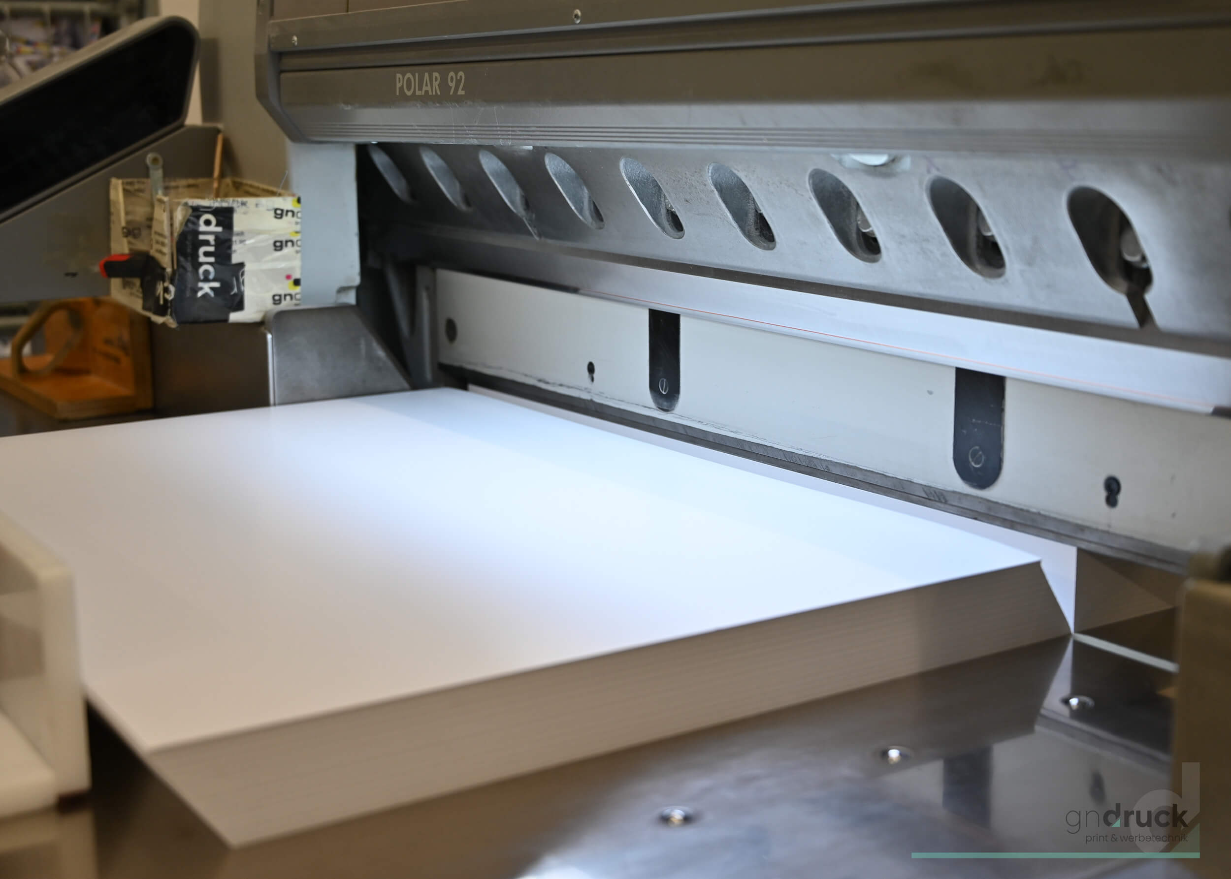 Unser Planschneider kommt bei nahezu jedem Druckprodukt zum Einsatz und sorgt für präzise Schnitte und saubere Kanten. Mit unseren modernen POLAR-Maschinen garantieren wir höchste Genauigkeit und eine perfekte Verarbeitung Ihrer Drucksachen, unabhängig vom Projektumfang.